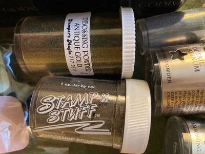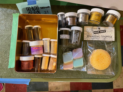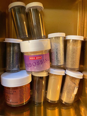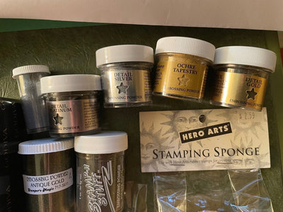 A collection of embossing powders in multiple colors and finishes (metallics and glitter), containers and small vials, and stamping sponges.