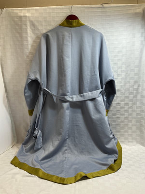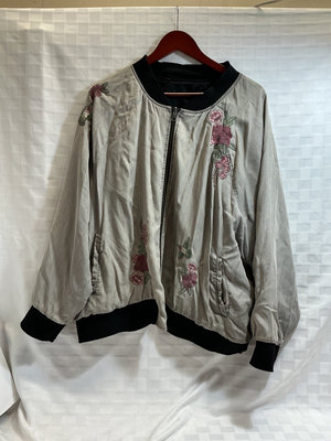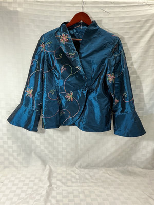 A light blue kimono-style robe with yellow trim and floral embroidery (polyester) and a blue satin embroidered short dress jacket. Gray silk bomber jacket with pink floral embroidery, and a bright pink satin button-front shirt. XL Likely a PJ top.