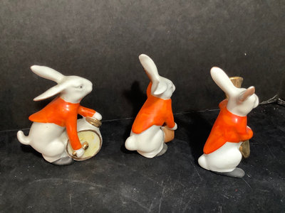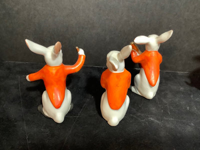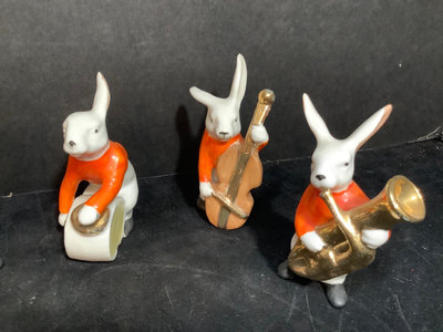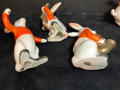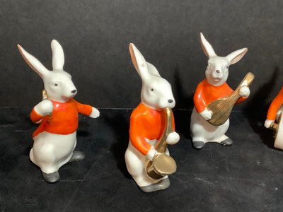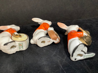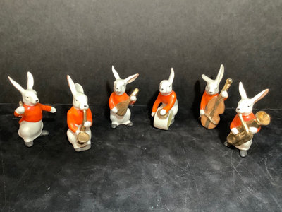 Vintage Erphila Germany ceramic Bunny band, hand painted, some paint rubbing thin but consistent with age, 3.25h. 6 pieces.