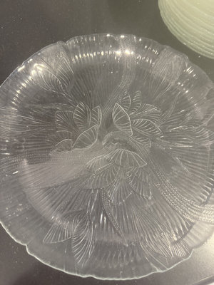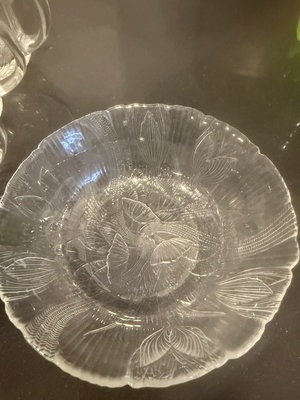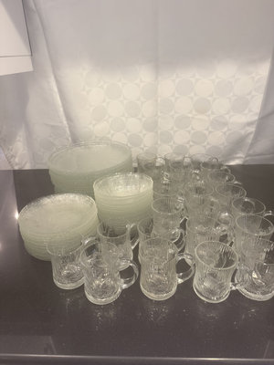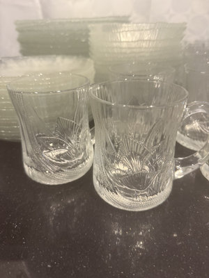 A collection of clear, etched glass drinkware and round etched plates, including mugs with handles and multiple decorative plates.