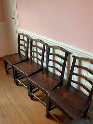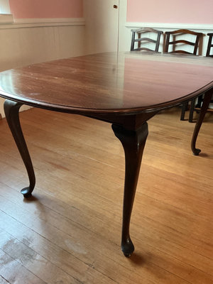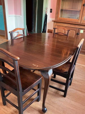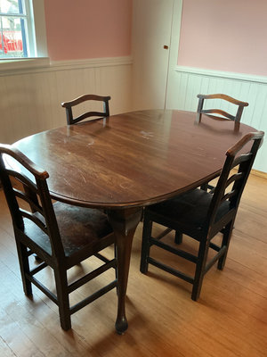 A dark wood dining set comprising an oval table with two removable leaves and four ladder-back dining chairs. Table is 61 inches wide and 40 inches deep by 29.5 inches tall. The leaves are 18 inches wide. Includes folding padded table cover. The surfaces have some scratches.