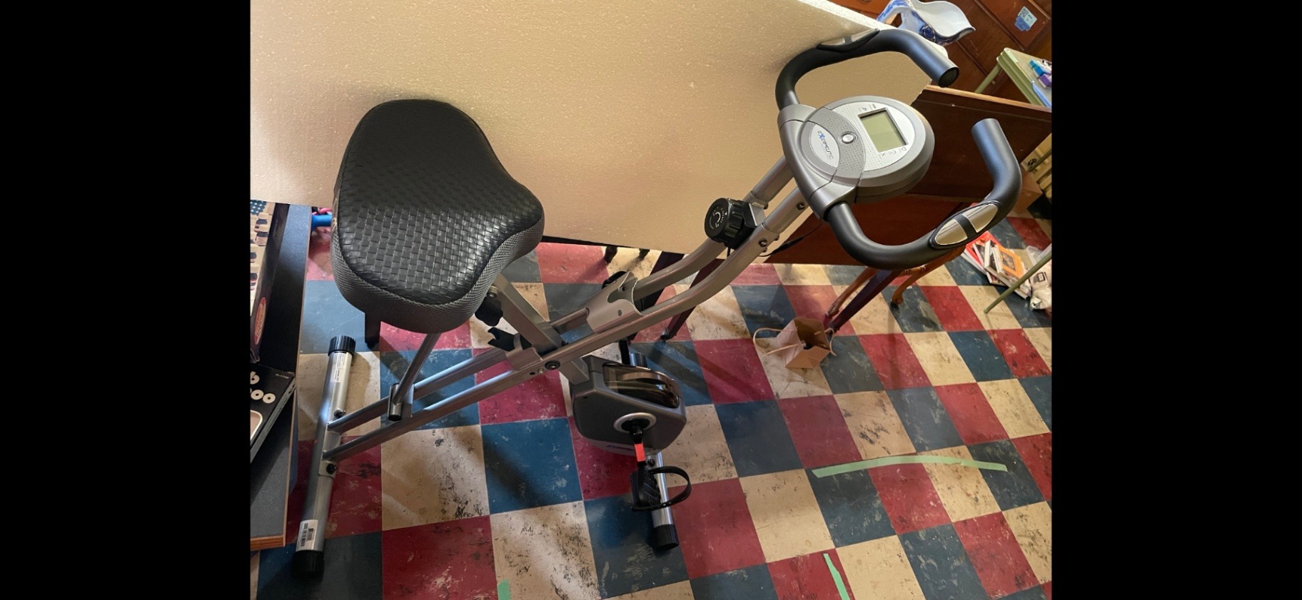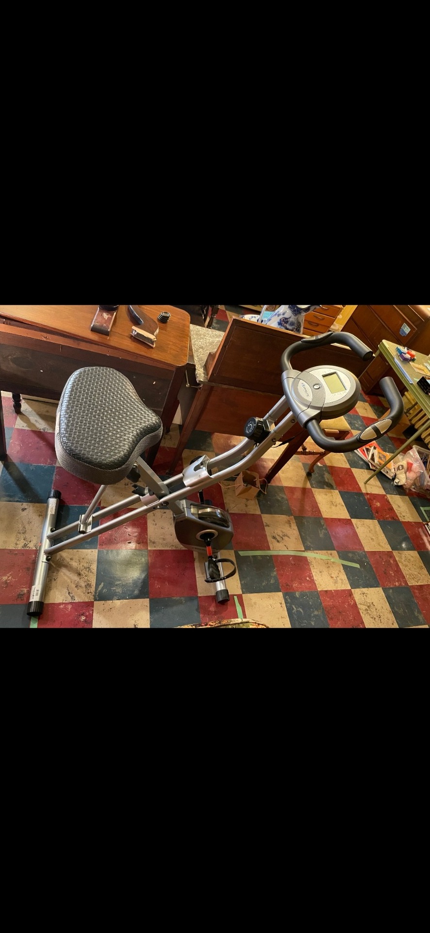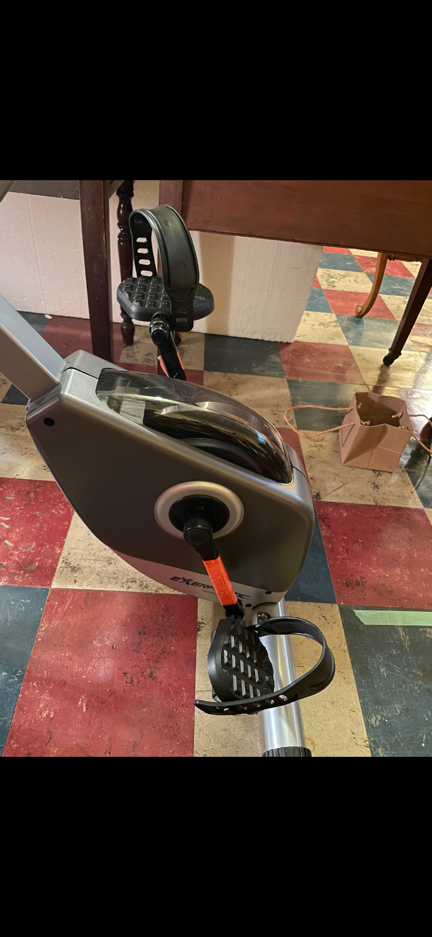 A compact Exerpeutic stationary exercise bike (model 4102K) featuring a central display, ergonomic handlebars, adjustable tension control, cushioned seat, and pedals with straps. **BRING HELP TO MOVE OUT OF BASEMENT
