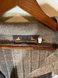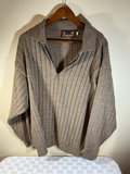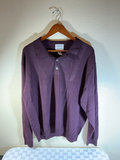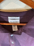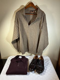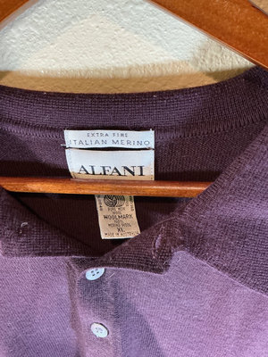 A collection of clothing and footwear including a gray ribbed knit zip-front sweater by Montechiaro, a purple Italian Merino polo-style sweater by ALFANI, both XL, and a pair of dark brown polished leather lace-up dress shoes by Bostonian, size 11.