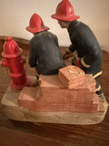 A decorative figurine scene featuring two firefighters in black uniforms and red helmets, working near a red fire hydrant and brick wall, mounted on a base with a label reading 'Firefighter Canadian Whisky'. 9" H approx