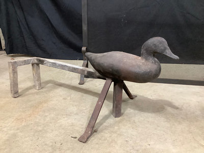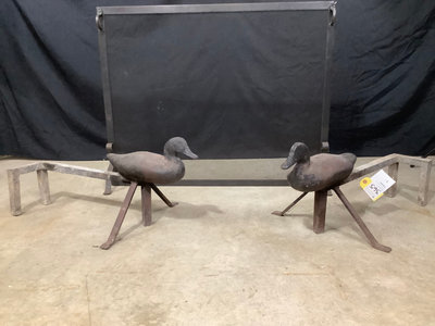 Forged iron fireplace screen, 31x39, and duck andirons. 3 pieces.