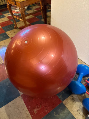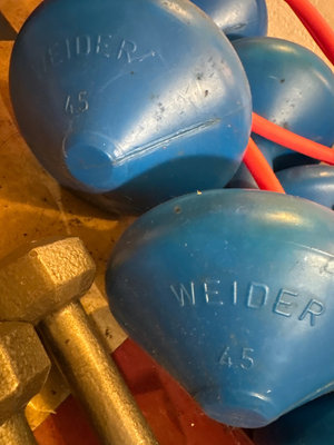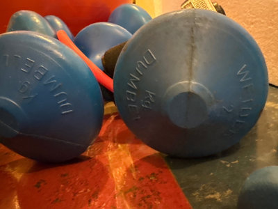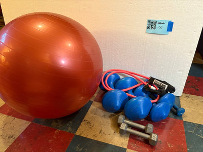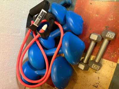 An orange stability/exercise ball, blue Weider weights (2 & 4.5 kg), 1 lb weight, a resistance tube with handles, and a pair of gray hex dumbbells (2 lb). **BRING OWN PACKING MATERIALS & HELP TO MOVE OUT OF BASEMENT