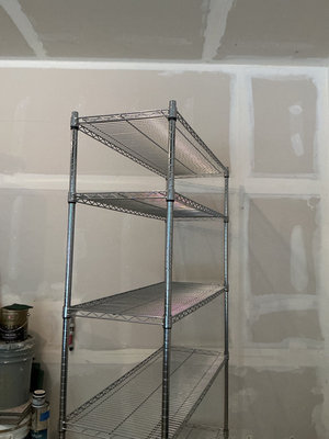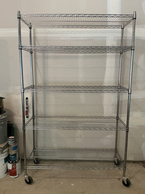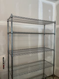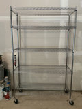 A five-shelf chrome wire shelving unit on caster wheels. 48 inches wide by 19 inches deep and 77 inches tall.