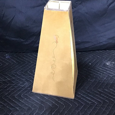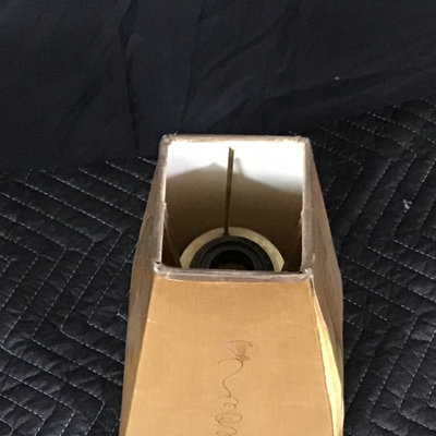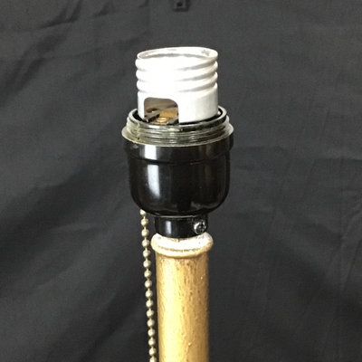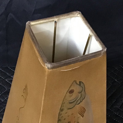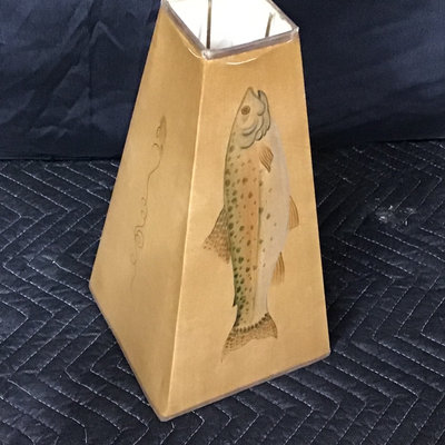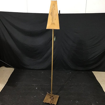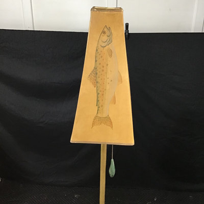 Heavy metal gold-painted base with hand painted fish shade, fish lamp pull. Shade is splitting at seam, cracked near top. 64h overall. 1 piece.
