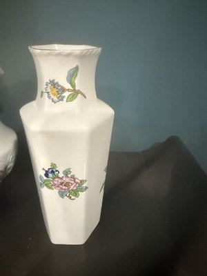 White porcelain set including a large floral-patterned pitcher with an ornate handle, a tall square-based vase, and a small floral bowl, all decorated with colorful flower motifs and gold trim.
