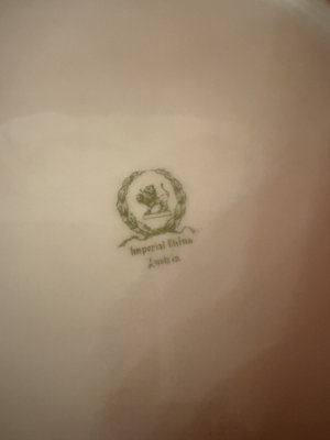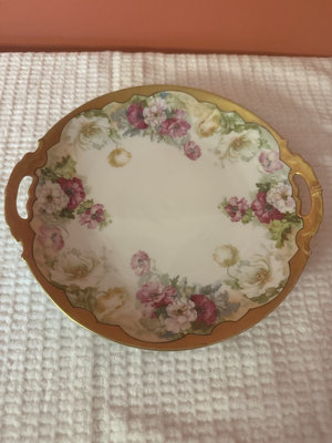 Round decorative porcelain plate featuring a floral bouquet around the rim with a gold-toned scalloped edge and integrated side handles; underside stamped with 'Imperial China'; about 10 inches in diameter.
