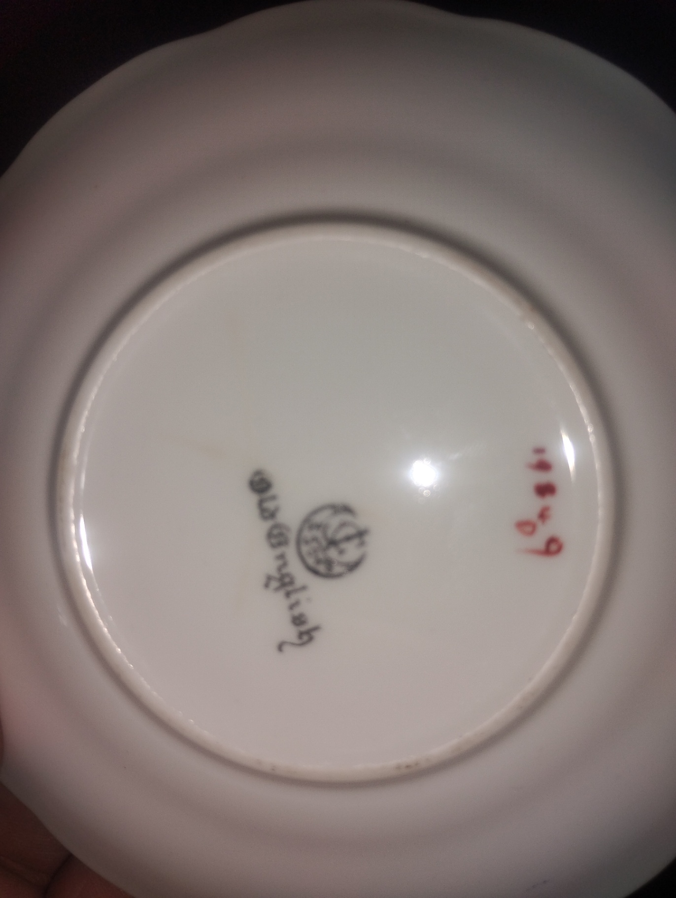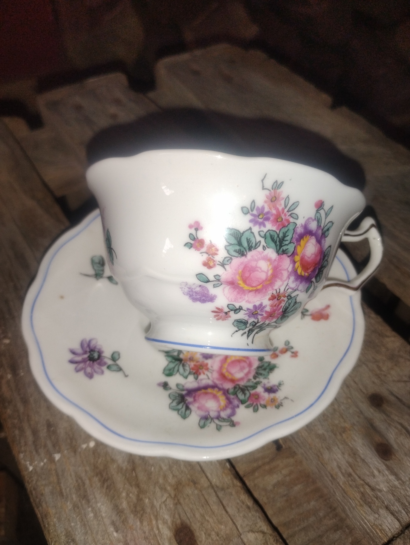 A porcelain teacup with a matching floral saucer; both pieces are decorated with pink, purple, and green flowers. The underside shows a maker’s mark.