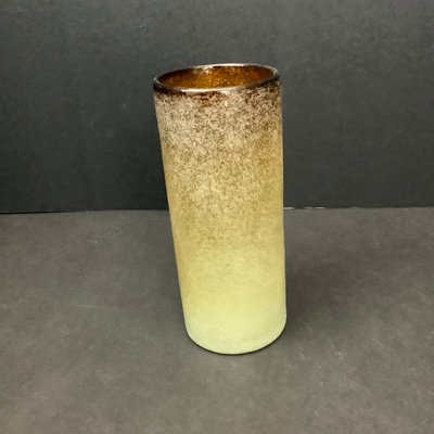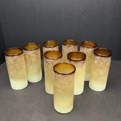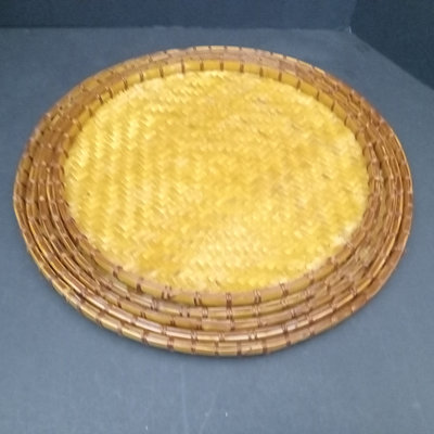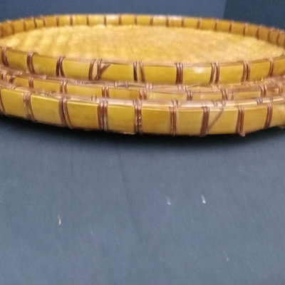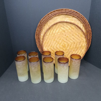 9 handblown bubble glass highball glasses with amber rims, 6h. Set of round woven rattan nesting trays, 13d, 14d, 15d, 16d, and 17d. 10 pieces.