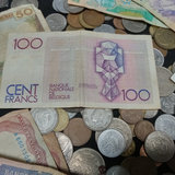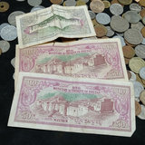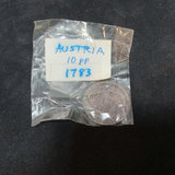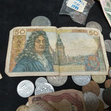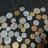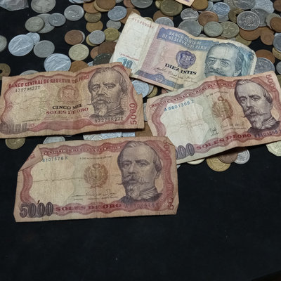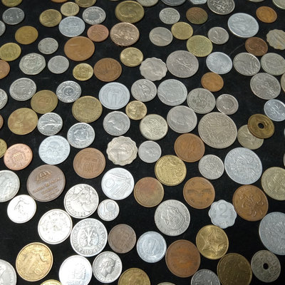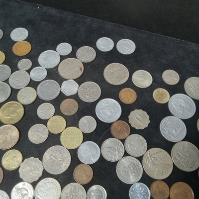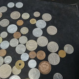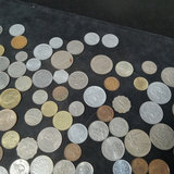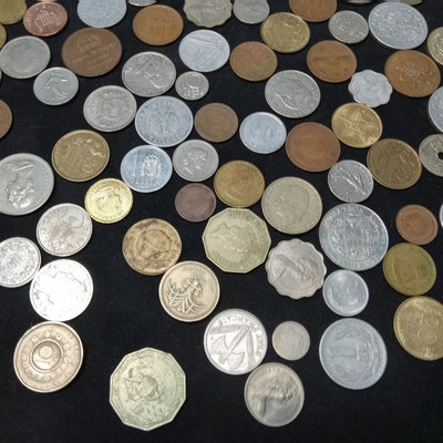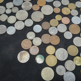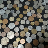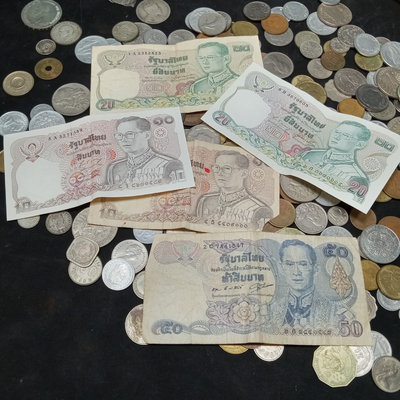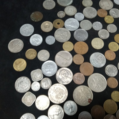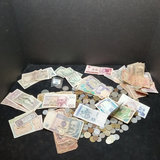 Paper money and coins from around the world, most from Europe and Asia, early to mid 1900s. Includes wartime currency, paper money from Kenya, India, Peru, Bhutan, Thailand, and more. Coins made of brass, copper, aluminum, maybe a silver piece or two. Austria 10 PF from 1783. 100 plus pieces.