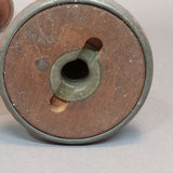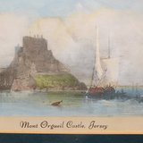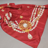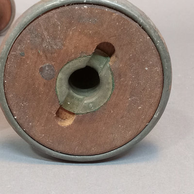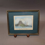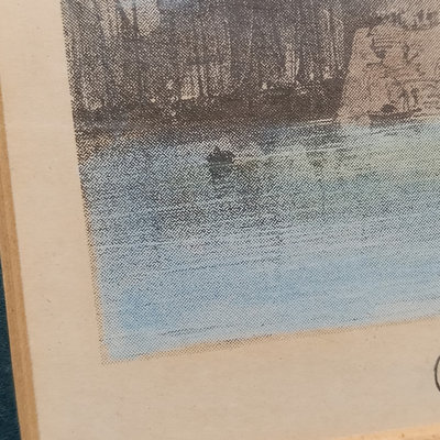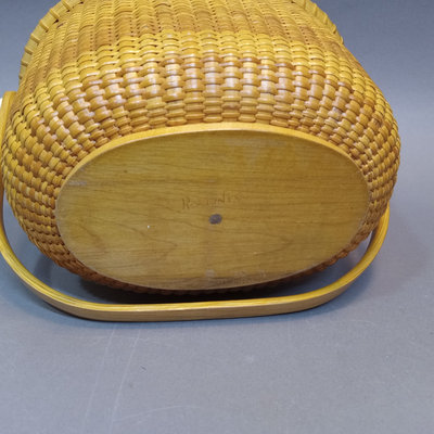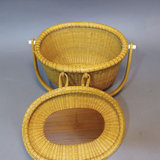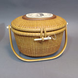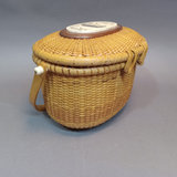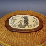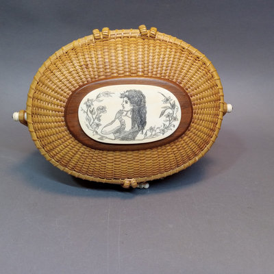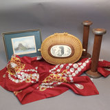 Vintage Nantucket Basket with Scrimshaw plaque on top, 10.5x7.5x11 to top of handle. Pair of antique wooden spools with metal edges, 9h. Framed color etching, 7x9 framed. Hand rolled Segalini silk scarf, made in Italy. 5 pieces.