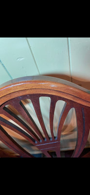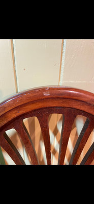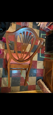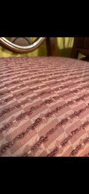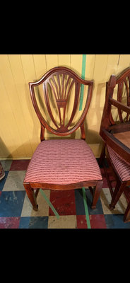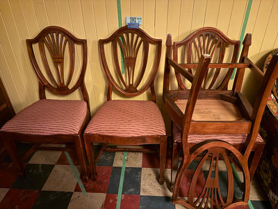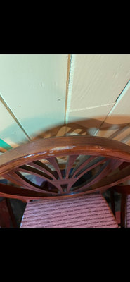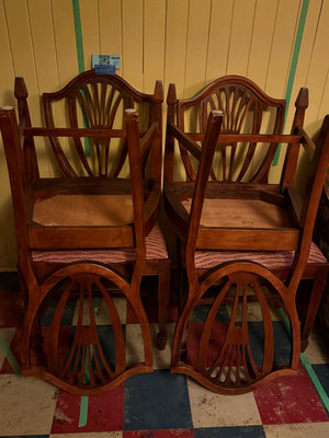 A set of 4 matching wooden dining chairs featuring fan-back carved backs and rose-coloured textured upholstery. ** LOCATED IN BASEMENT, AS IS AS FOUND.