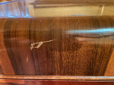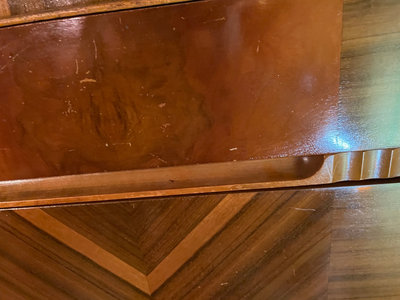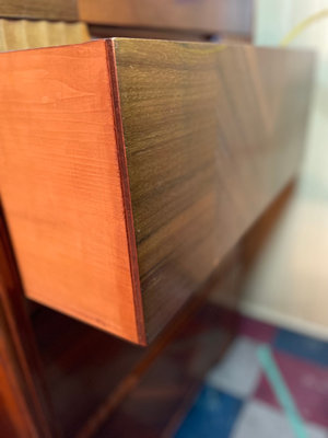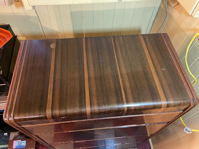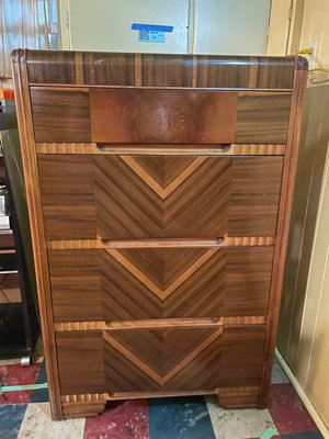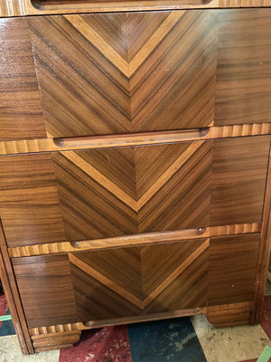 A vintage walnut chest of drawers with four drawers, each front featuring chevron veneer patterns forming V shapes, with integrated pull grooves and decorative edge details. Note condition as is as found. 32wx17dx48h. ** BRING HELP TO MOVE OUT OF BASEMENT.