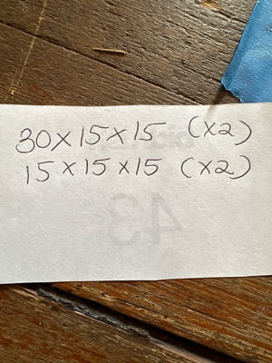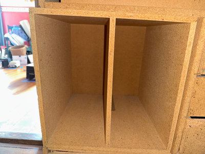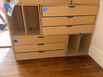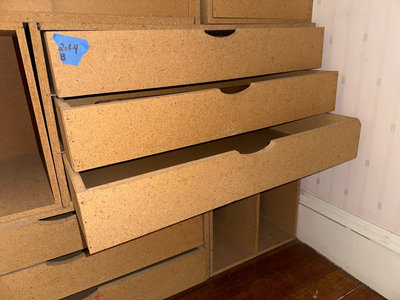 OSB modular storage units featuring drawers and two with open compartments. Some visible damage.