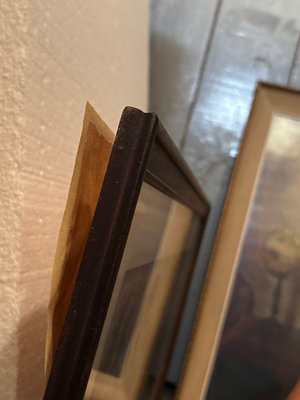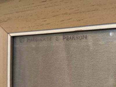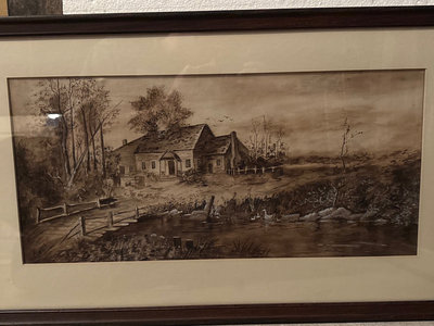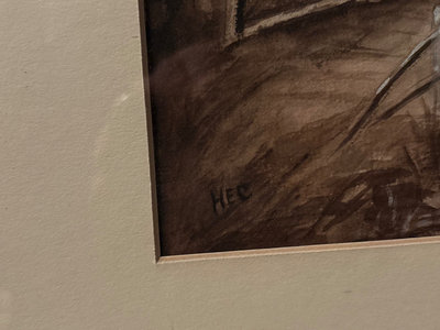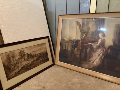 Two framed artworks: a sepia-toned landscape of a house by water by HEC, and a figure at a piano in a music-room setting by Marguerite S Pearson. Dimensions: Large: 29.5”x23.5” Small: 22.25”x14.5”