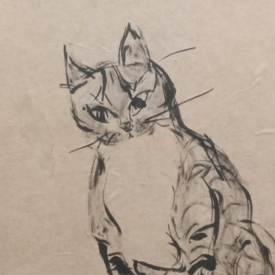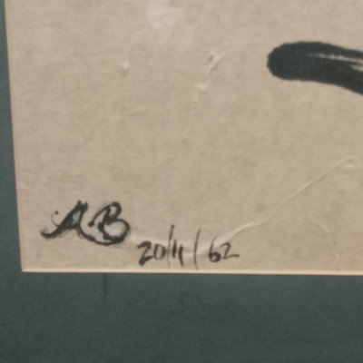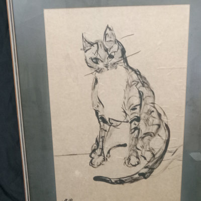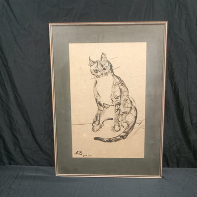 Framed drawing of a cat, signed AB 20/11/62. Art 20.5x13, frame 27.5x19.5. 1 piece.