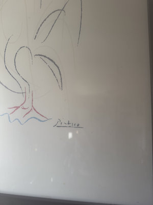 A framed abstract line drawing of a rooster with red and blue accents. A handwritten back label references Picasso and lithography and notes the size 40x26;