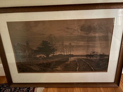 Framed in distressed copper paint on solid wood frame in the Victorian style. Painting by Robert Walker Macbeth entitled: "In the Evening There Shall Be Light" 38.5" w, 26.75' h Signed: Etched by Alfred-Louis Brunet Desbaines