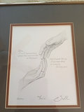 A framed pencil drawing of two hands with a handwritten quote, together with a limited-edition Robert Sexton print (edition 396/600, 14 x 19 inches) numbered 396 out of 600