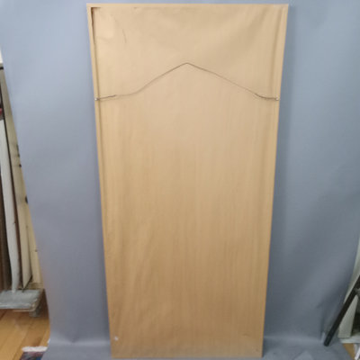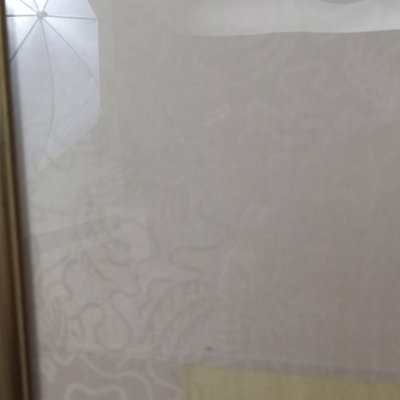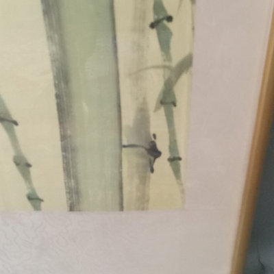 Large framed Japanese watercolor, birds flying around bamboo, stamped on right side. Mounted on silk and framed. Light damage to one corner of frame. 55x25.5 framed. 1 piece.
