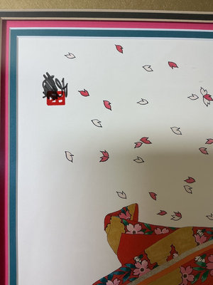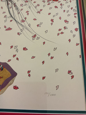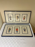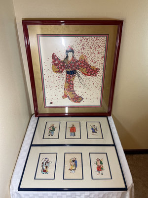 A collection of framed prints, a limited edition signed print of a geisha in a floral kimono with falling petals and several smaller framed figures in traditional attire, arranged in multi-panel displays. The geisha print measures 28 inches wide and 32.5 tall. The three panel prints are 25x13 inches.