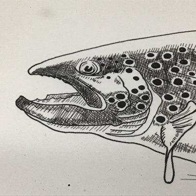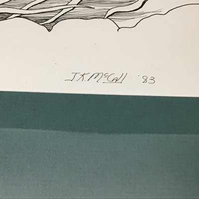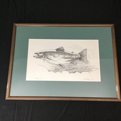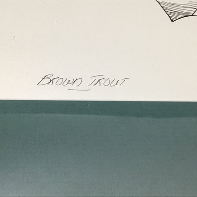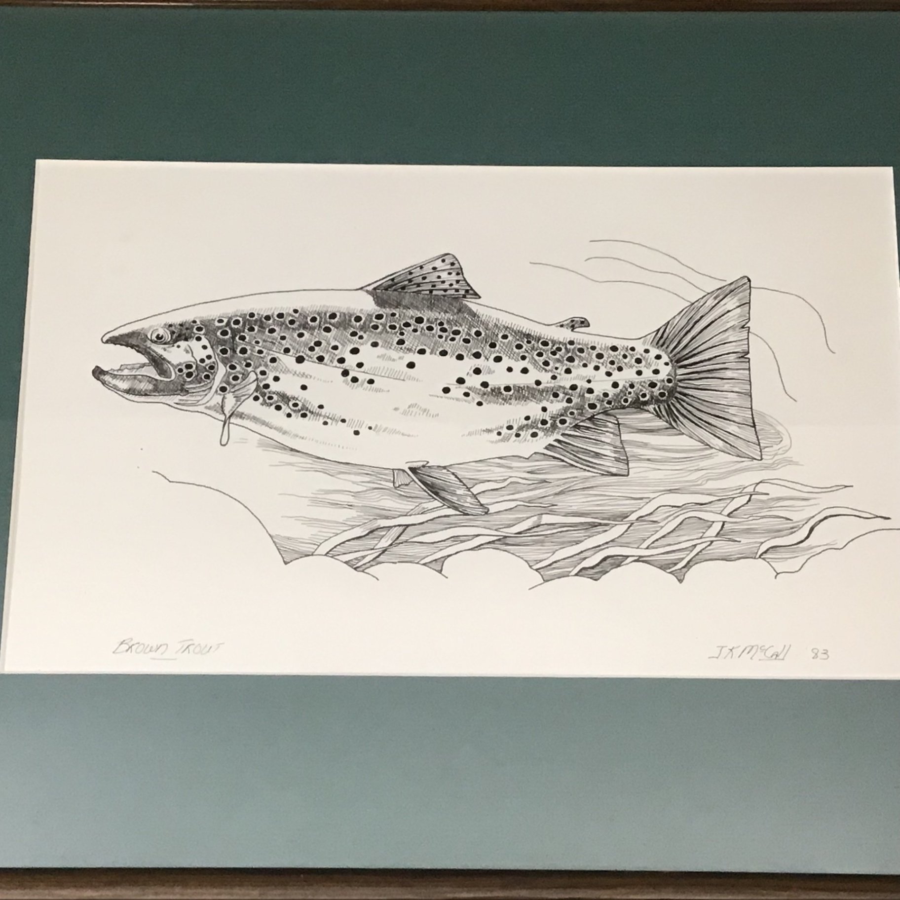"Brown Trout '83" by J.K. McCall. Framed Pen & Ink. Art 7.5x12.25, frame 13.75x18.5. 1 piece.