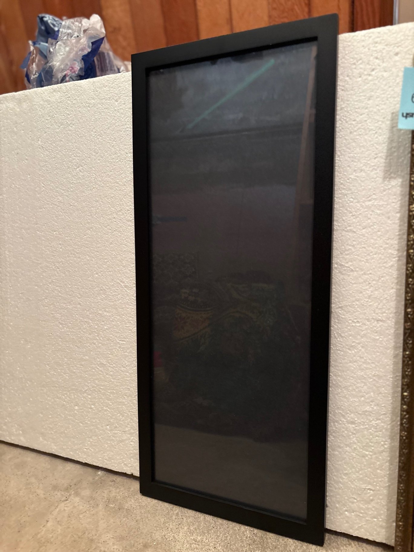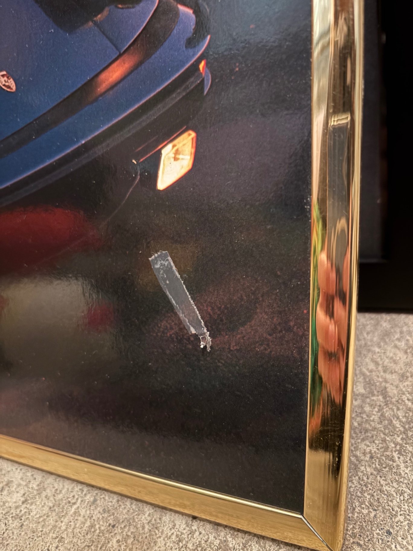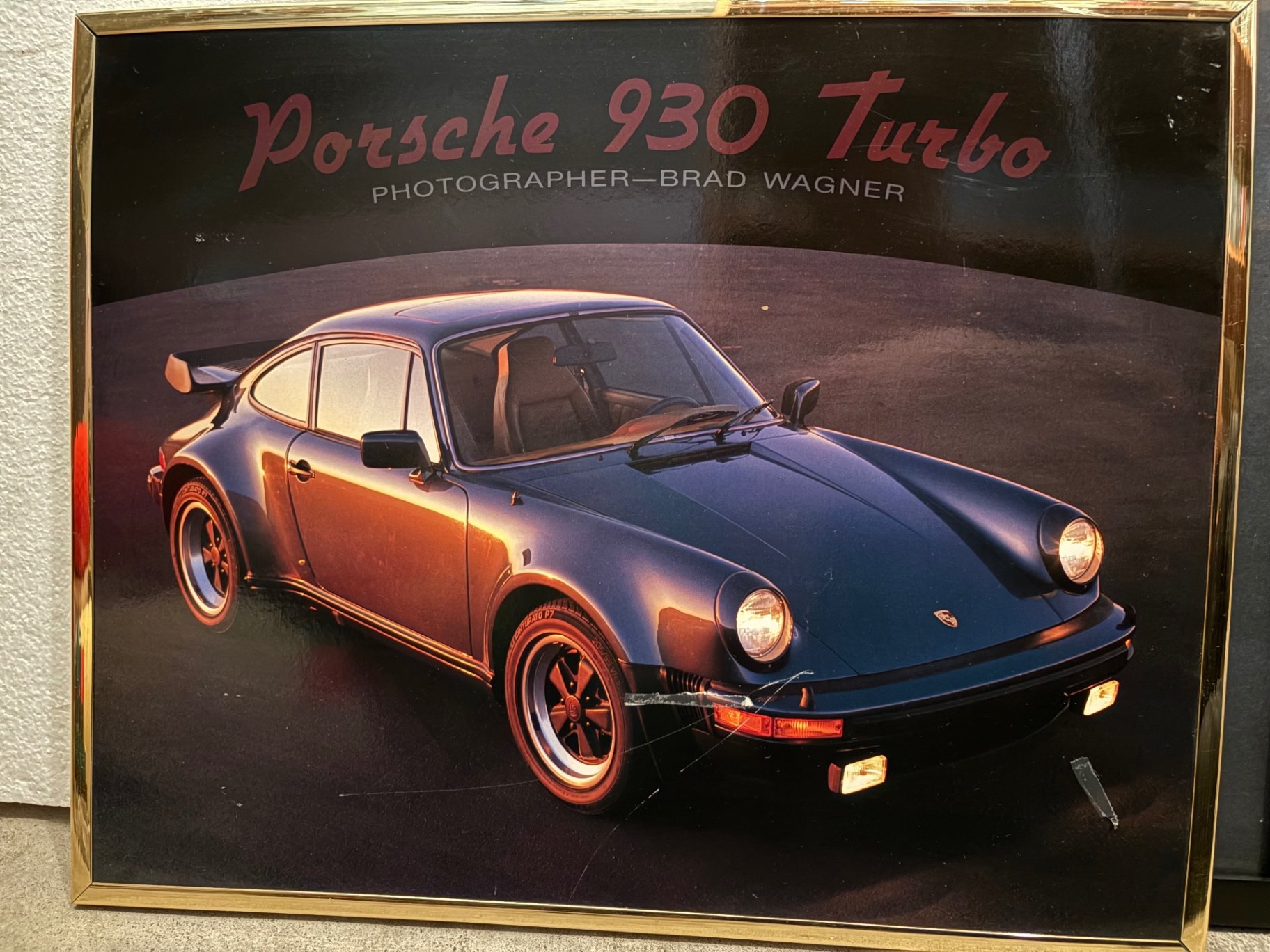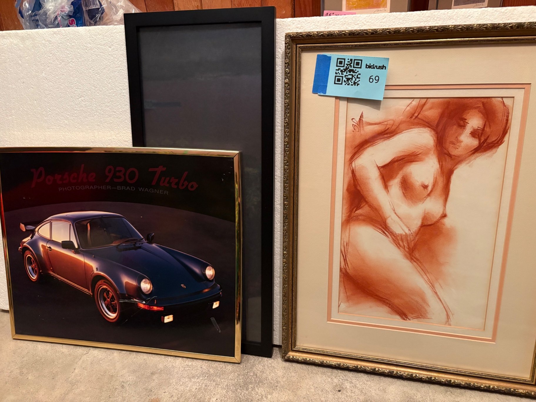 Two framed artworks: a Porsche 930 Turbo photograph by Brad Wagner and a reclining nude figure drawing, accompanied by an additional black empty frame.