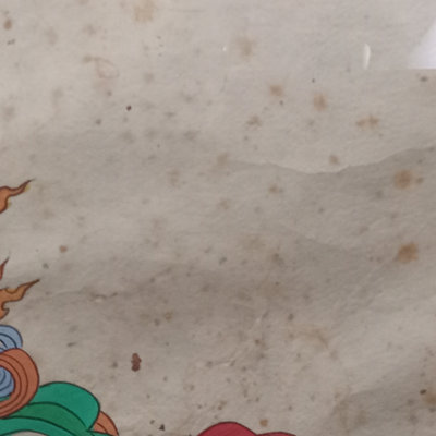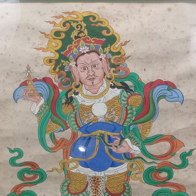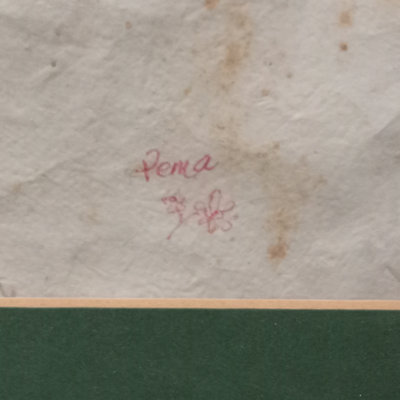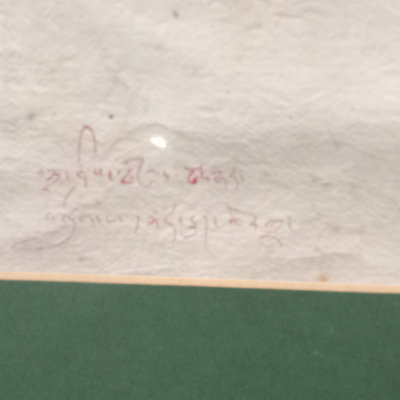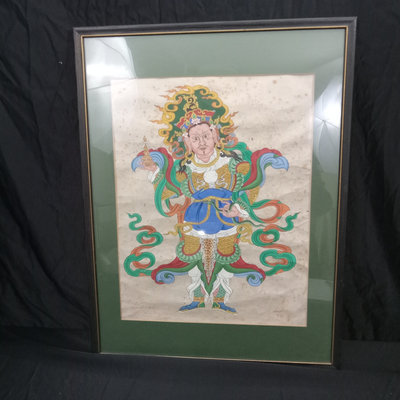 Vintage framed Tibetan painting, signed bottom left. Foxing on paper. Art 18x14, frame 25x19. 1 piece.