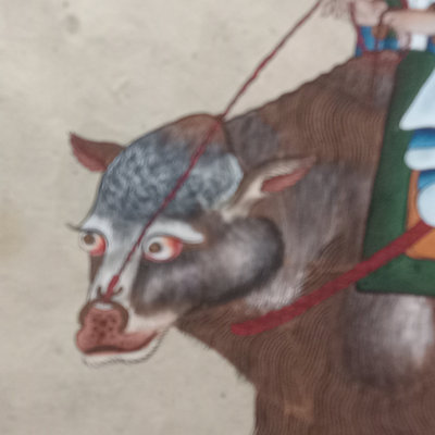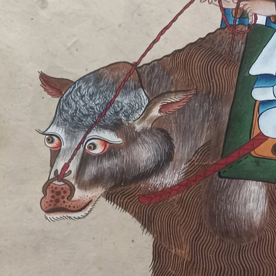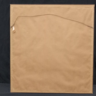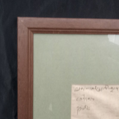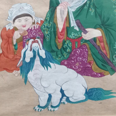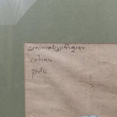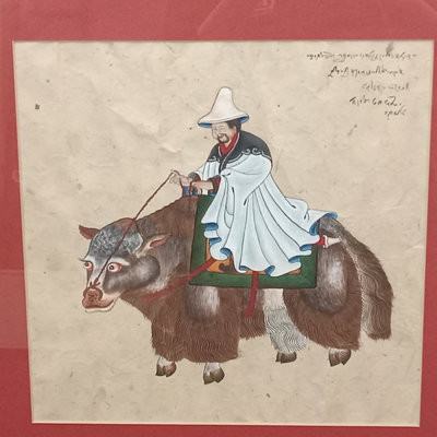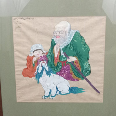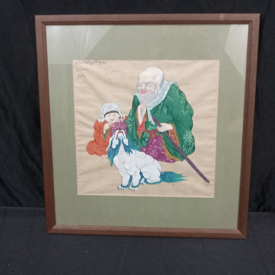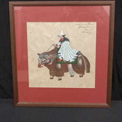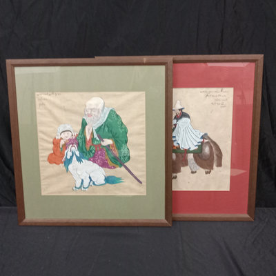 Hand painted on paper and framed, writing in the corner of each. Old Man with Child Feeding a Dog and Yak and Rider. Art 11sq, frame 17.75x16.75. 2 pieces.