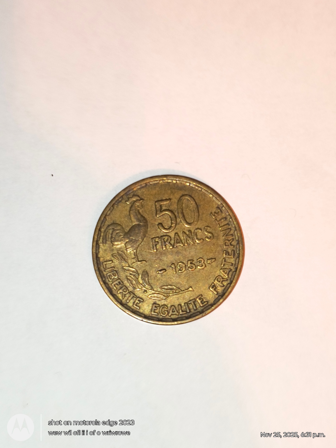 Two views of a French 50 Francs gold coin from 1953, one side showing a rooster and the motto Liberté Égalité Fraternité, the other side displaying a Marianne-style portrait.
