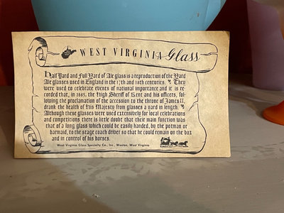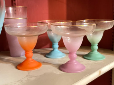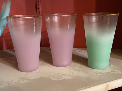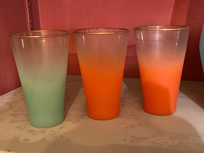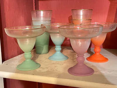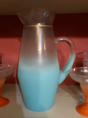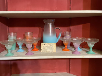 Vintage West Virginia Glass handmade 11.5h colored half-frosted pitcher with gold ribbon at neck. Matching varied color half-frosted 5.25h iced tea glasses and 5h margarita glasses. 15 pieces.