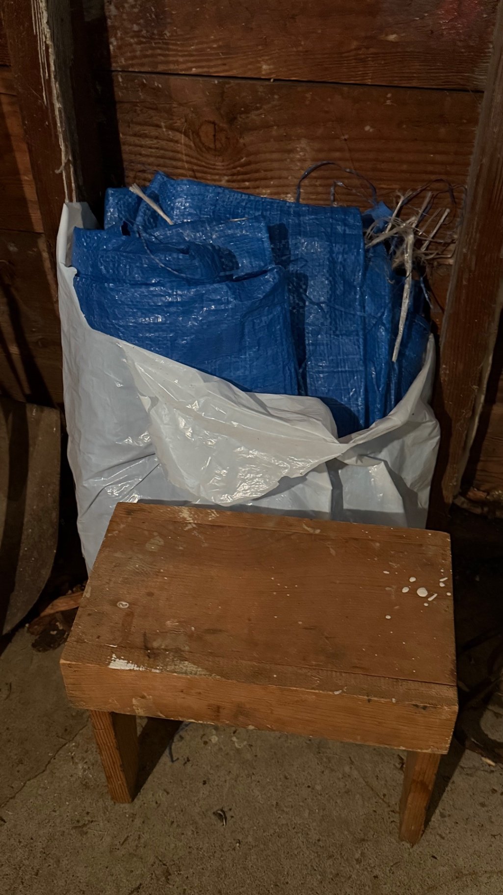 A collection of garage items including a Fiskars extendable tool, two long-handled shovels, two digging blades, orange extension cords with clamps, and a bag containing blue tarps. As is as found. **BRING OWN PACKING MATERIALS & HELP TO MOVE