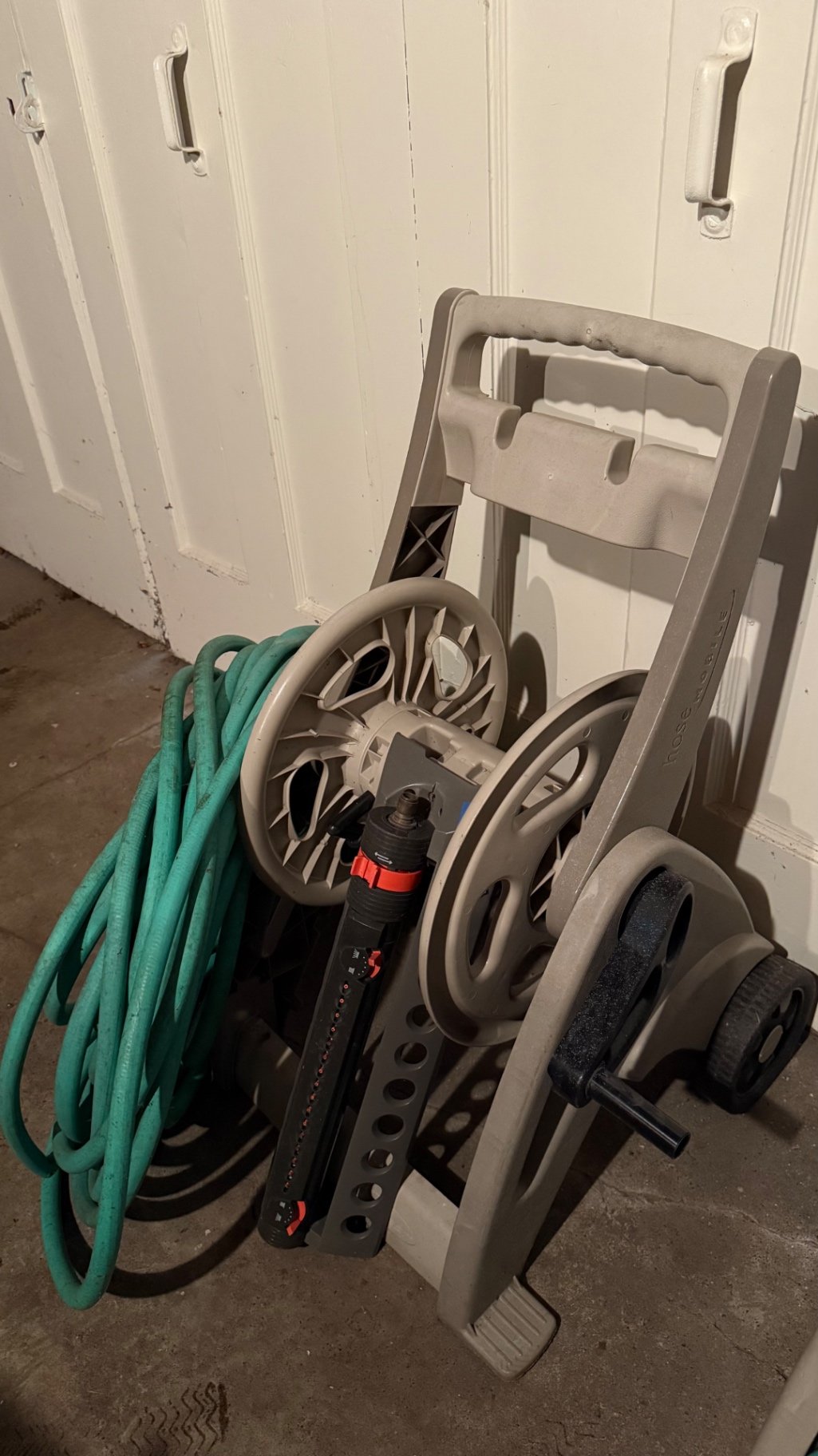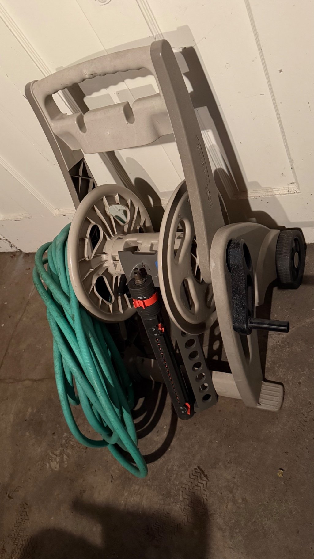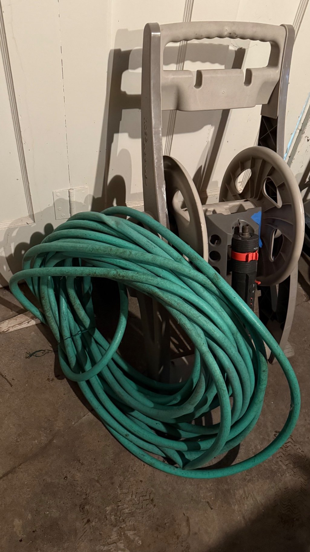 A green garden hose is coiled around a gray wheeled hose reel cart with a frame, handle, and winding crank. Untested.