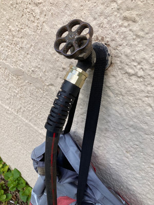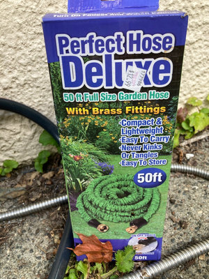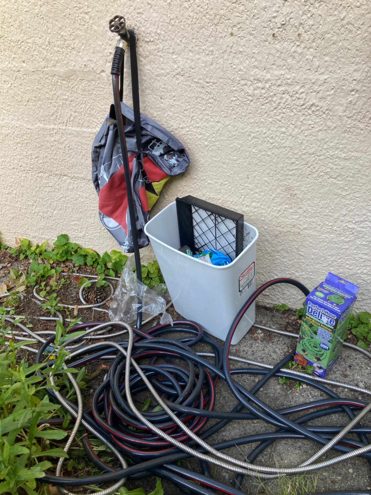 collection of garden hoses and accessories including a boxed 50-foot Perfect Hose Deluxe, multiple coiled hoses, white tub with assorted components.