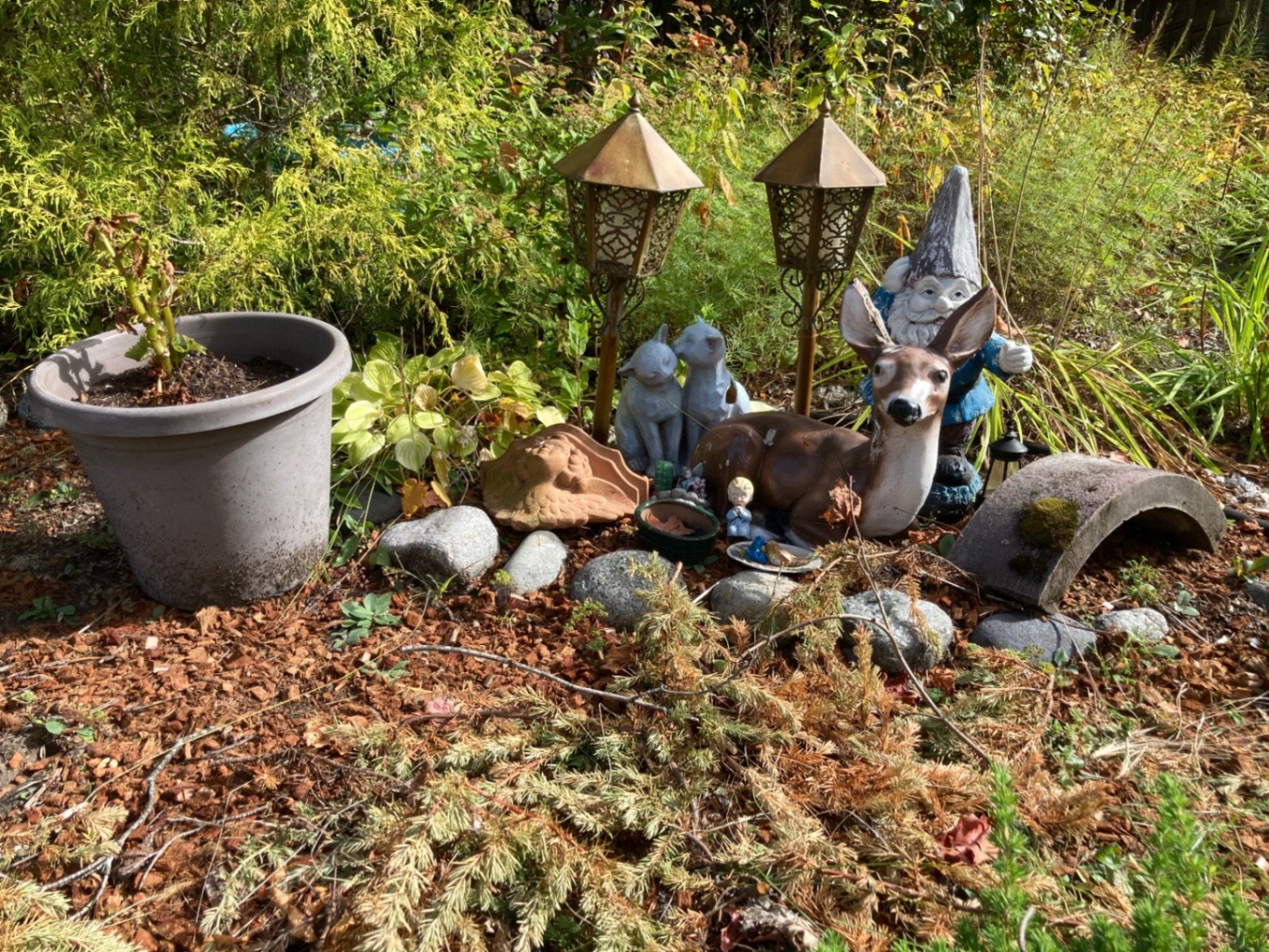 A collection of outdoor garden decor including a gnome statue with a pointed hat, a deer figurine, two decorative lanterns, a large plant pot, and various small ornaments. Weathered