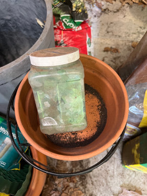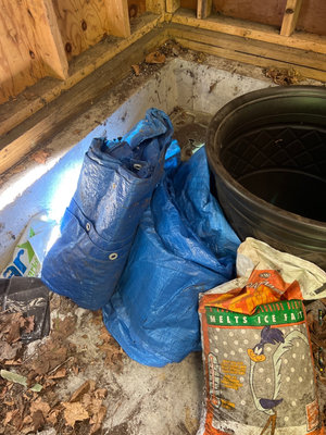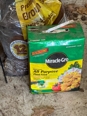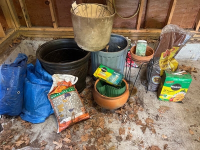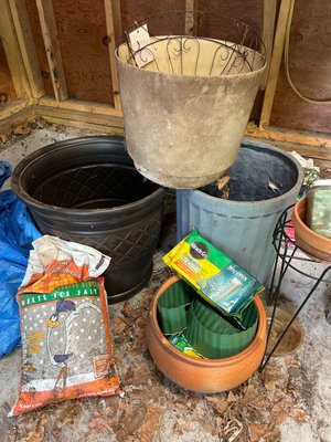A collection of yard and garden items including a Miracle-Gro All Purpose Plant Food box, an ice-melt bag, several plastic and terracotta plant pots, blue tarpaulin bags, a large black plastic tub, metal wire plant basket, and miscellaneous gardening containers and bags. Largest planter plastic 31 x19 inches Located in garage.