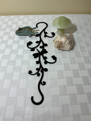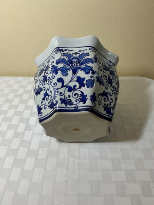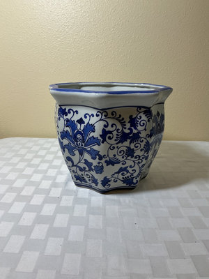 A collection of yard and garden items including floral-patterned gardening gloves, pruning shears with a green handle, a decorative black metal hanger, a lavender-themed rectangular planter, a blue-and-white floral ceramic pot, a white pot, twine, tape, and assorted garden supplies.