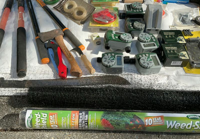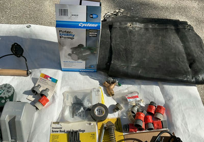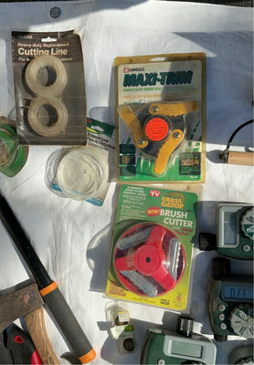 Includes hose faucet timers and splitters, a pump for a fountain, weed shields, a shade cover and all you see.