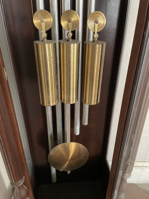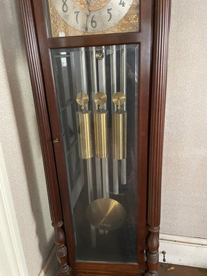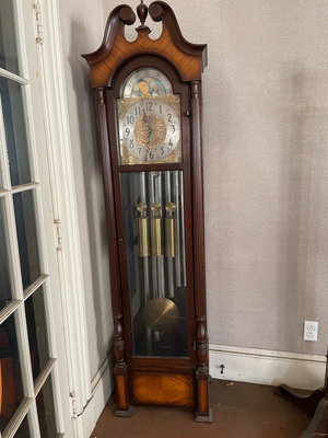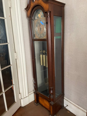Vintage Grandfather / Case clock by General Electric, metal face includes moving ship. Untested. 21x13.5x75. Heavy, bring help and appropriate vehicle to pickup. 1 piece.