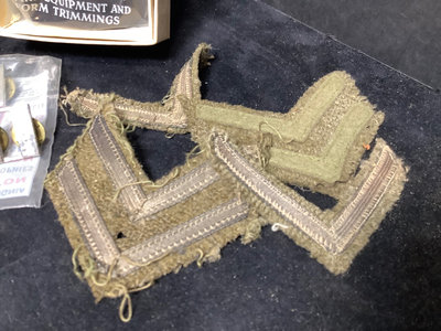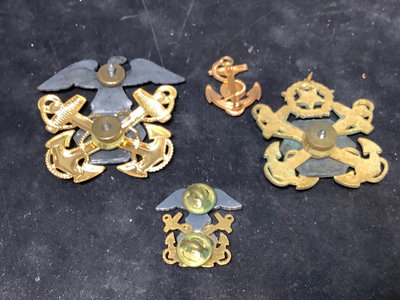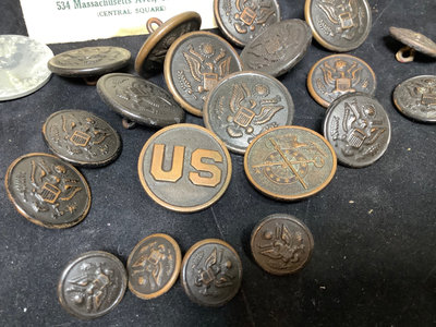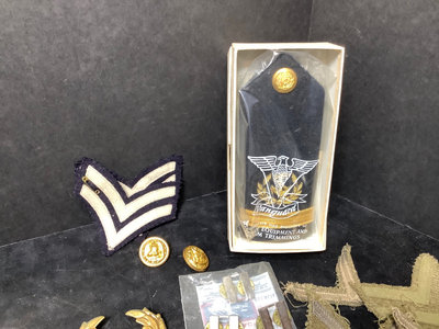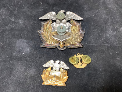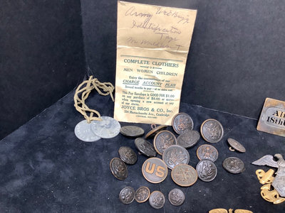 Civil War badges - Grand Army of the Republic and Sons of Union Veterans. WWI Army - clothing buttons in 3 sizes, ID tags, Quartermaster and US pins. Maine Maritime Academy badges. Miscellaneous bars and trimmings. 20 plus pieces.