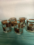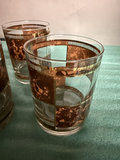 A set of five clear glass tumblers with copper-brown decorative bands arranged in geometric patterns.