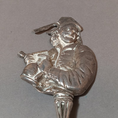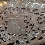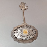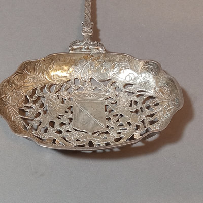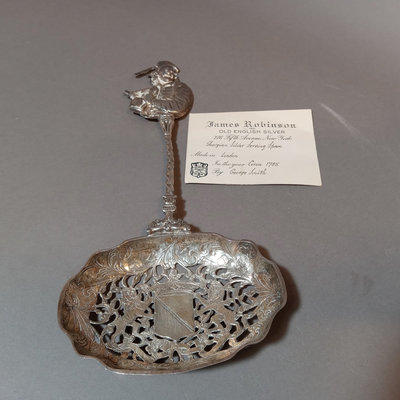 Antique reticulated bowl serving spoon with accompanying card from antique store, Georgian Silver Serving Spoon, Made in London, circa 1785 by George Smith, 9in long. 1 piece.