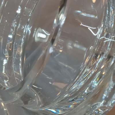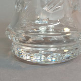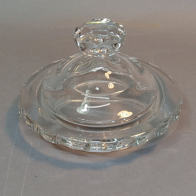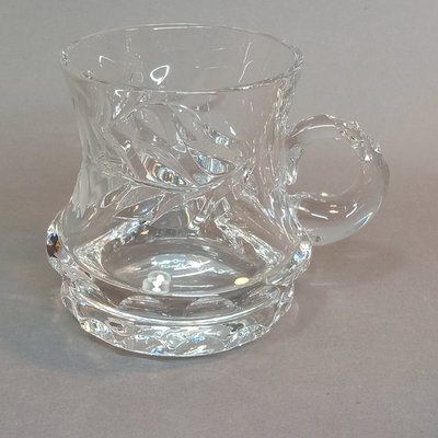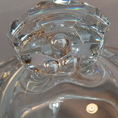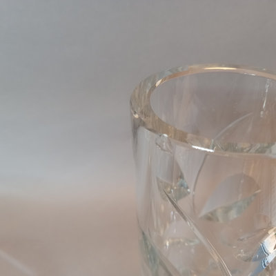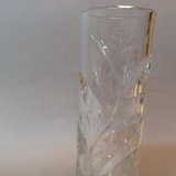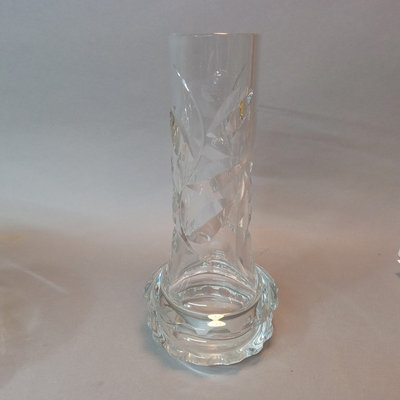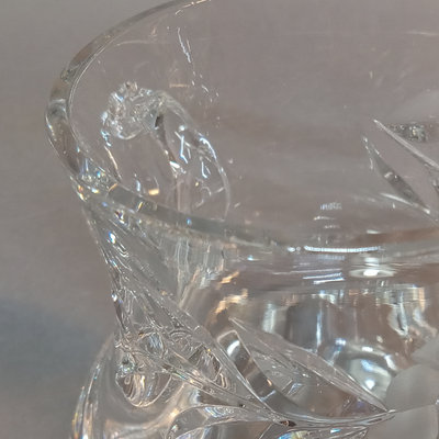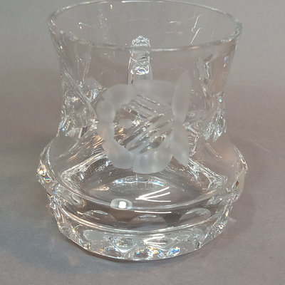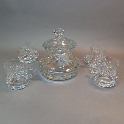 German crystal lidded bowl used to hold sherbet, ice cream, or whipped cream with punch, 6.5d x 7.5h w/lid, plus for crystal glasses with tiny flea bites on rim of each, etched rose and leaf design matching Lot 409. Similar design German crystal bud vase, small chip on rim, 8.5h. 6 pieces.
