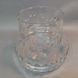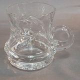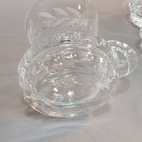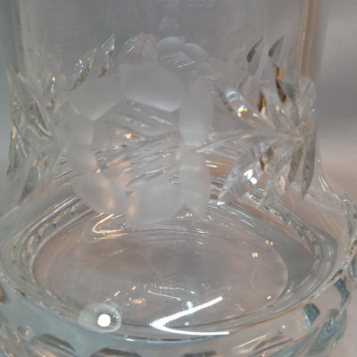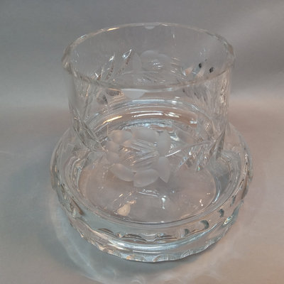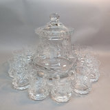 Vintage German crystal lidded punchbowl, etched Rose and leaf design, 10d x 11.5h with lid. 12 matching punch glasses, 3.5h. Purchased in Germany. 13 pieces.