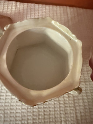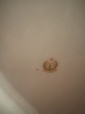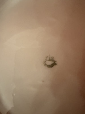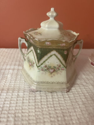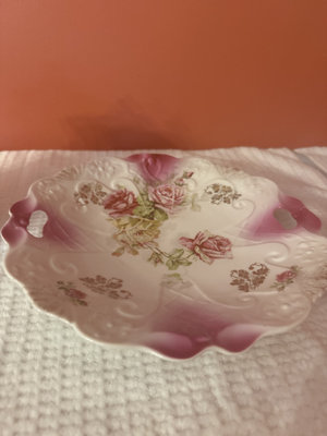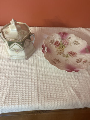 A decorative porcelain set consisting of a lidded bowl 10" with two handles and a matching scalloped-edge dish measures 7" Both pieces are adorned with rose floral patterns and soft pastel shading.