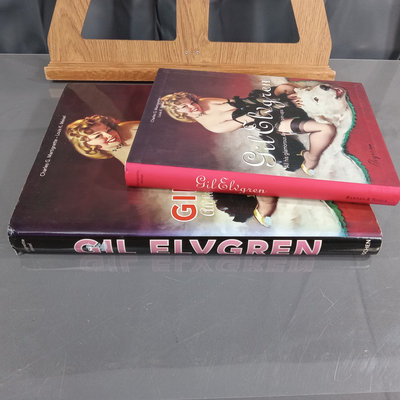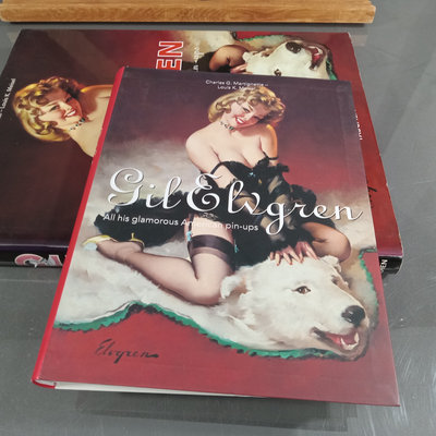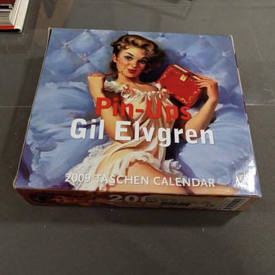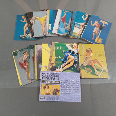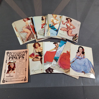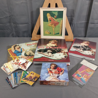 The art of Gil Elvgren, includes unopened wall and desk calendars, same hardcover/softcover book, postcard from private collection, trading cards, and small framed print. 6 plus pieces.