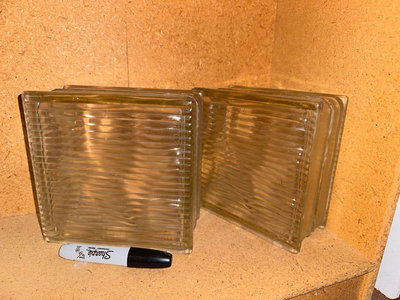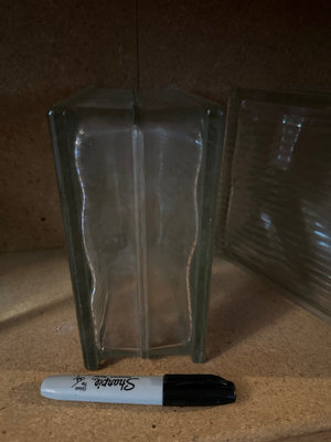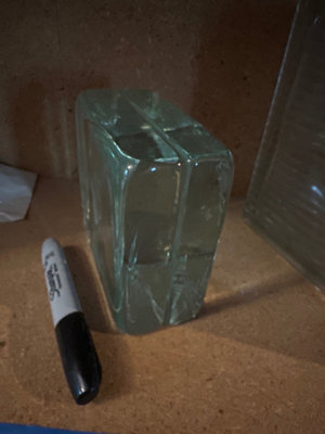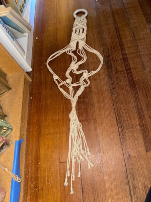 A collection of decorative and hardware items: glass blocks/panes, a macramé plant-holder. Hanging decoration with attached pods and succulents, a small ceramic pot with rope handle, several wooden furniture legs with threaded bolts, plastic-wrapped figurines.